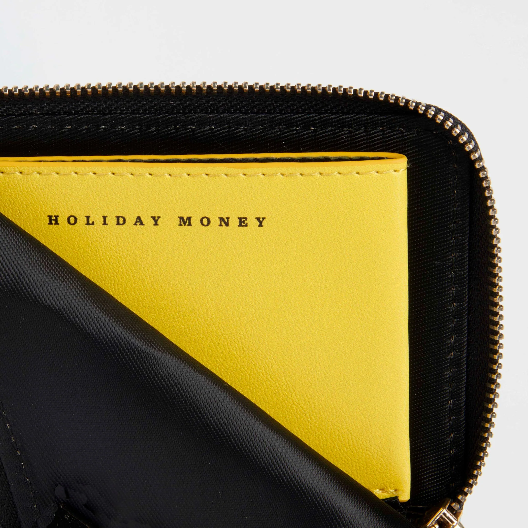 Contrasting colour internal central pocket screen-printed with 'holiday money' text.